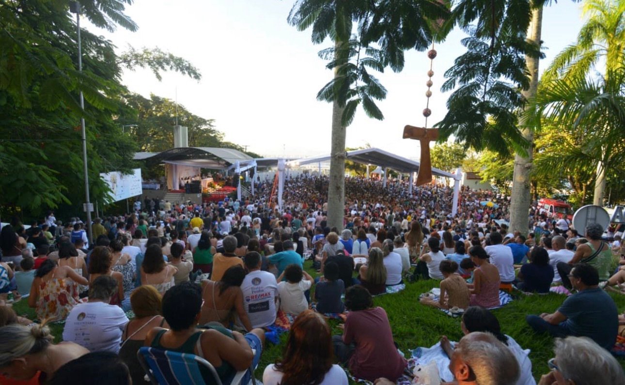 Fiéis ocuparam o Campinho do Convento da Penha na tarde deste Domingo de Páscoa (5) para acompanhar a missa de abertura da Festa da Penha 2026. A celebração foi presidida por Frei Daniel Dellandrea, representante do Ministro Provincial, e marcou o início do oitavário com uma mensagem centrada na esperança e na fé no Cristo Ressuscitado.