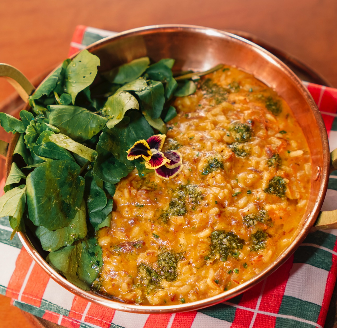 Prato – Risoto de Rabada e gremolata de agrião – risoto inspirado em homenagem à junção ítalo-brasileira. Valor: R$ 99, individual.