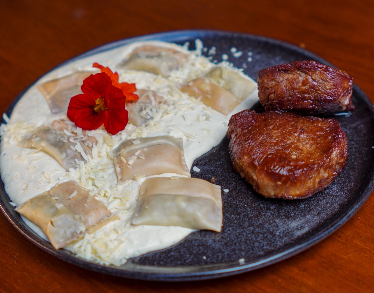 Prato – Ravioli duplo – Ravioli metade ossobuco cremoso, marinado por 12h e metade parmesão, ricota e tomate seco, acompanhado de molho Alfredo e filé mignon. Valor: R$ 109, individual.