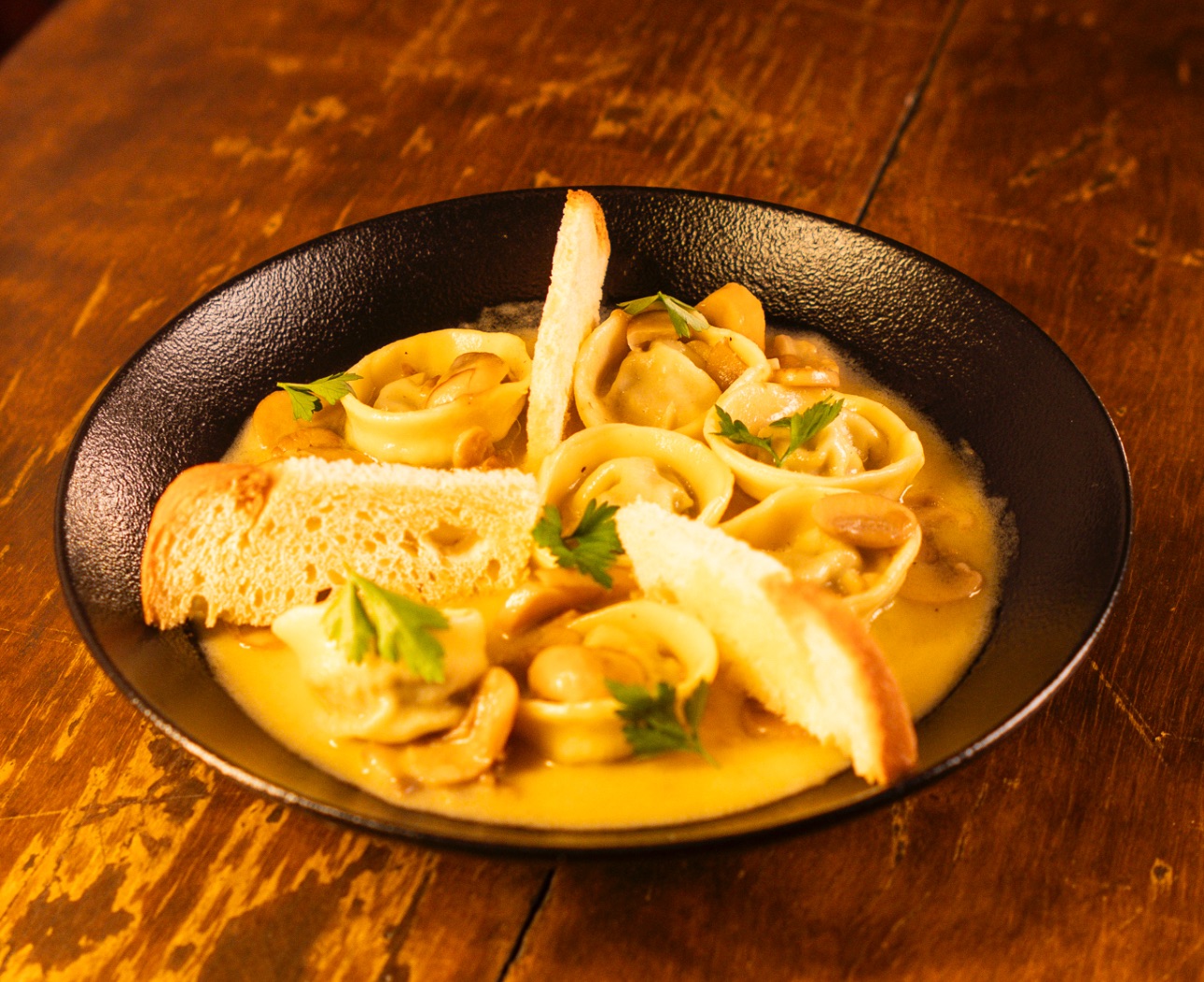 Prato – Capelete de Cogumelos e ricota – Capelete de Cogumelos e ricota ao molho de creme de leite fresco, cogumelo, alho e limão. Servido com finas fatias de pão. Valor: R$ 99, individual