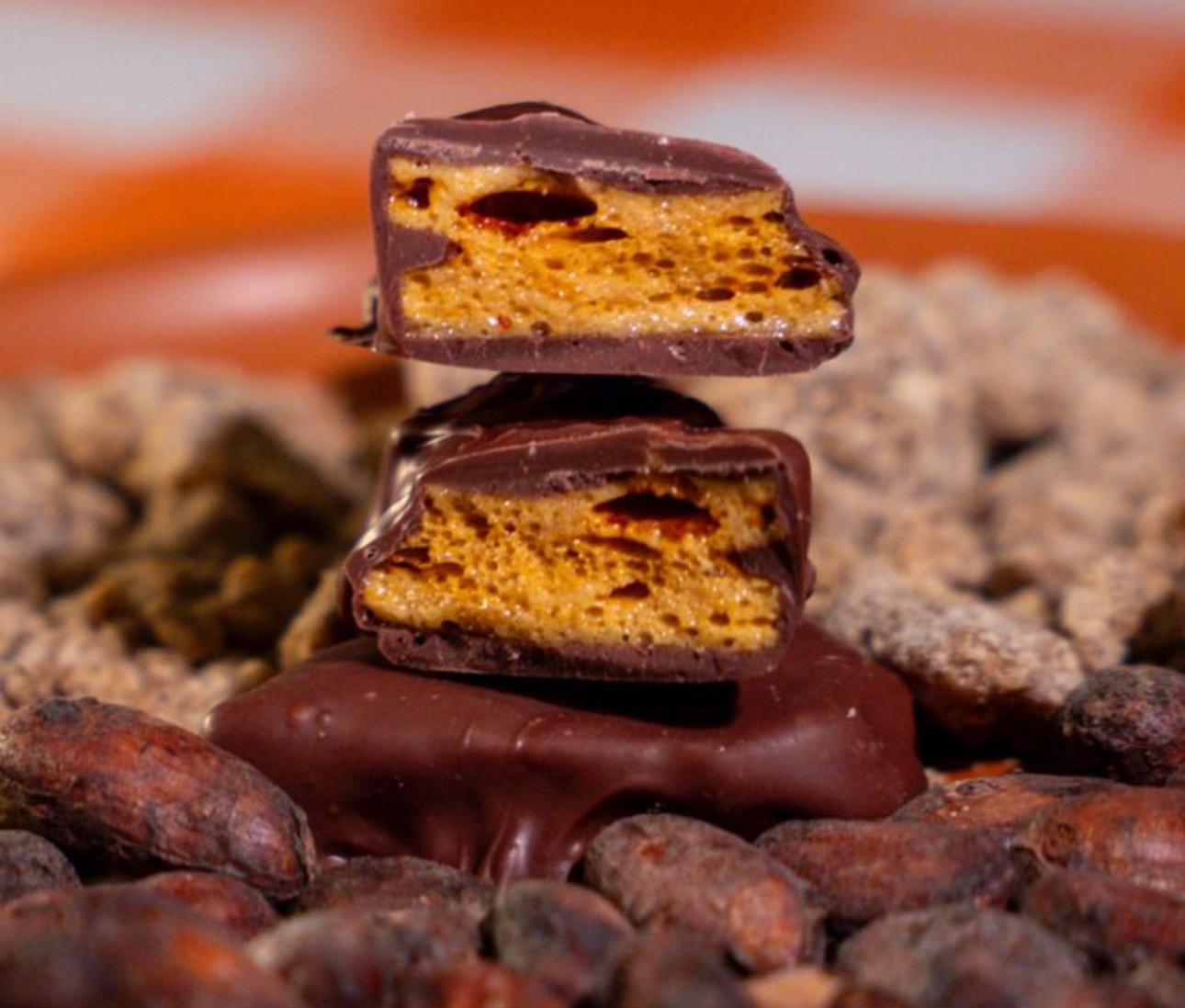 Prato 1 – Toffee de Açúcar Mascavo e Mel com chocolate 45% cacau ao leite / Toffee de Açúcar Mascavo e Mel com chocolate Branco 150g. Valor: R$ 45. Prato 2 – Torta Pistache. Valor: R$ 26, a fatia.