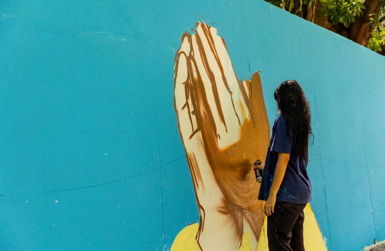 Fred Farias, estudante de Serviço Social e artista ligado à cultura Hip Hop, leva ao mural referências às suas vivências em manifestações populares e religiosas. Em sua obra, a fé aparece associada à alegria e à defesa dos direitos humanos. Inspirado nos ensinamentos do Papa Francisco e na oração de São Tomás Moro, ele retrata o pontífice e a frase “Concede-me a graça de compreender os sorrisos, para que conheça na vida um pouco de alegria”.