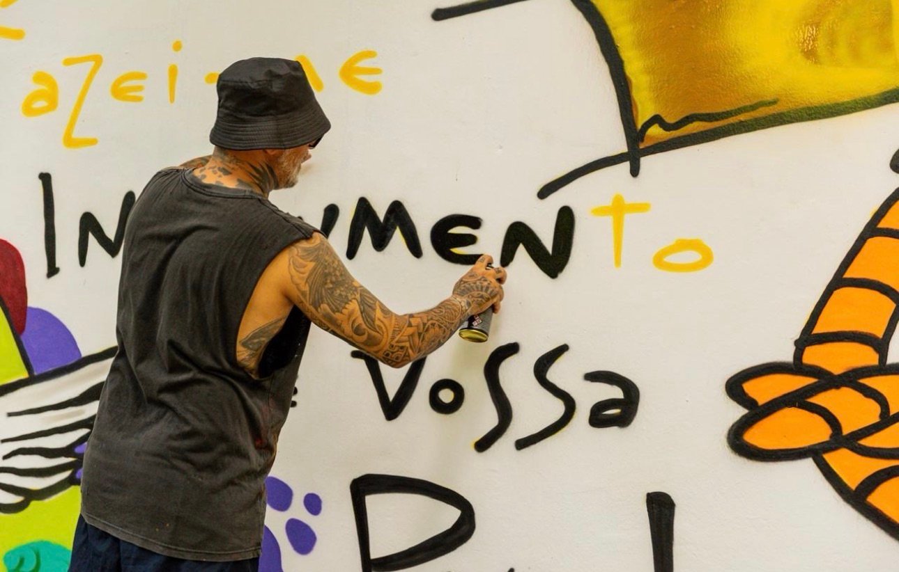 Com mais de 20 anos de trajetória no grafite, Anderson Moska traz experiências acumuladas em países como Uruguai, Argentina, Chile, México e Senegal. No Convento, sua intervenção apresenta São Francisco de Assis envolto por pássaros, em uma composição que destaca valores como paz, simplicidade e respeito à natureza.